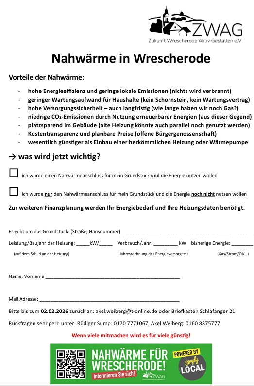 wir wenden uns heute an Sie, um Ihnen die aktuellen Pläne und Projekte des ZWAG (Zukunft Wrescherode Aktiv Gestalten) vorzustellen und Ihre Meinung zu erfragen. Für eine Woche unterstützen uns zwei Jugendliche im Alter von 16 und 17 Jahren, die Ihr soziales Praktikum beim ZWAG absolvieren.